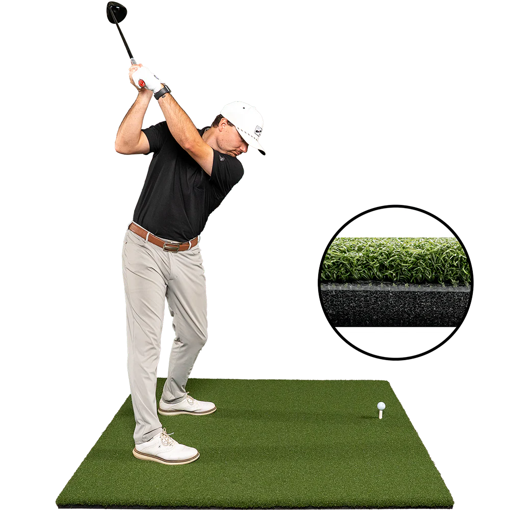 Yes. With its non-slip base, the Super Tee stays put during full swings, making it perfect for garages, simulators, and indoor bays. Players can use it as a standalone surface or pair it with a putting green for a complete indoor hitting bay.